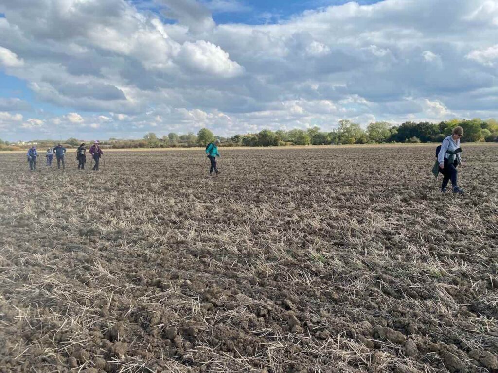 Continuing further along the road, passing a row of houses some now derelict, we then turned right, into the car park of a conference venue, onto a path, doubling back westwards through some woodland where, fenced to our left, the humungous car park of British Car Auctions(BCA) appeared. Then ahead the path took us between two metal wedges onto an open field. This had been recently ploughed, and indeed a tractor could be seen moving in the distance doing the ploughing! We carried onwards towards, and in between, two more metal wedges at the opposite side of this field, then entered into another ploughed field, and crossed the Marston Vale railway into a third field.