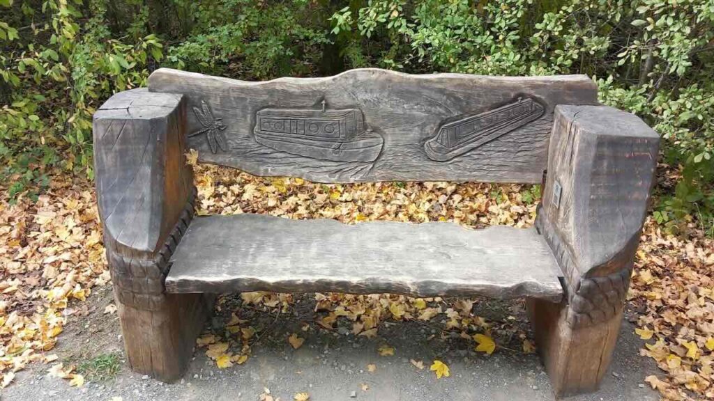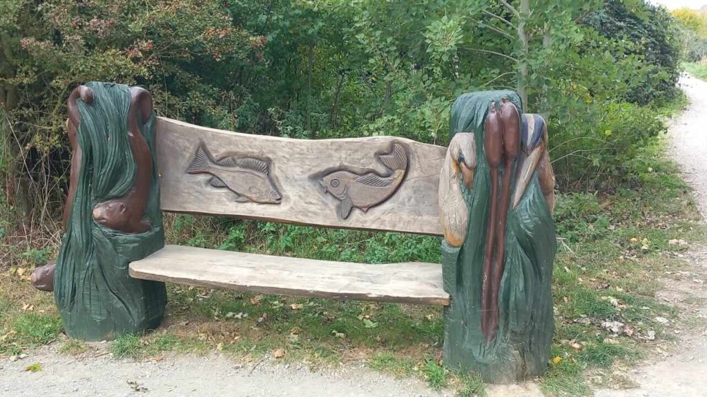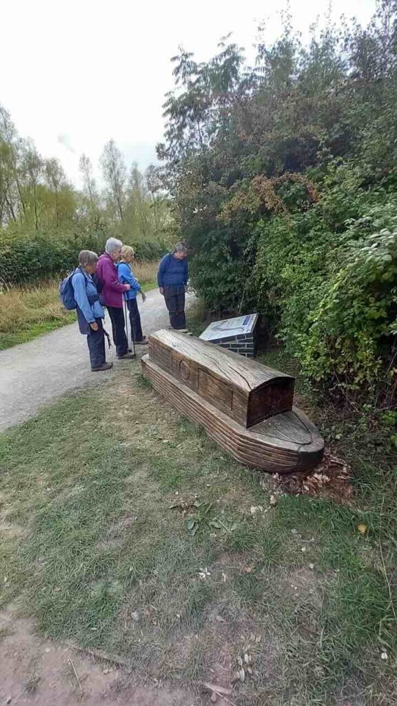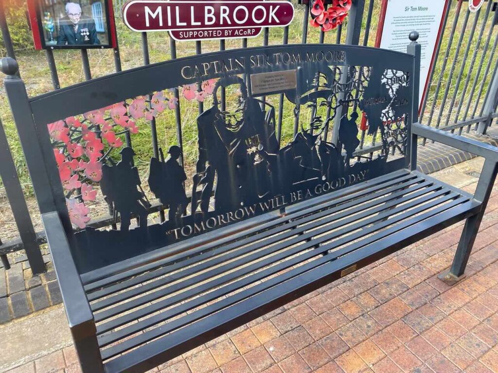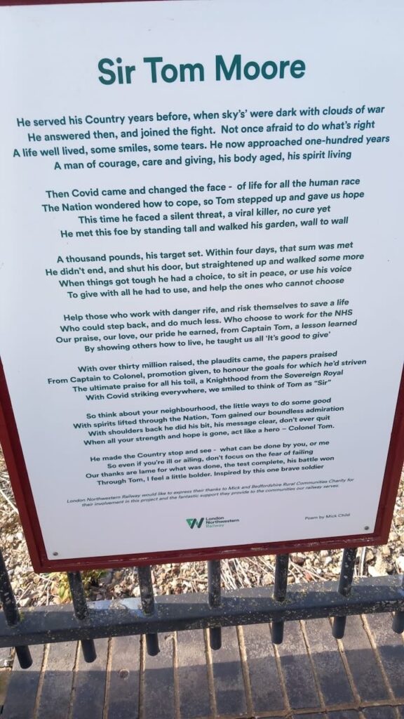 By now we were well over halfway through the ramble. After lunch we continued around the edge of the forest along shady tracks with occasional seats carved of of logs with various patterned shapes. A mile and a bit later we reached Millbrook station in good time for the Bedford train. Attached to the platform fences were some information boards about Captain Sir Tom Moore, a local hero during COVID times, including some lovely poetry. We all boarded the train to Bedford. At Bedford station I directed most of the party to the next fast London train and we said our goodbyes as they boarded.