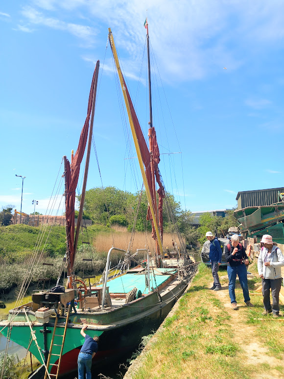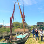 Partway along the Cray we came across the sailing barge, Decima (built 1899). The well-known sailing barge restorer and shipwright Tim Goldsack, bought Decima in 2003 and completed a major restoration. Then Tim sold Decima to David Leal in 2016, our guide and historian.  David invited us through a locked gate and gave us some of the history of the barge including ‘one of the first steel barges carrying cargo from as far away as Cornwall, for the local mills, and bricks made locally from the Crayford marshes, up to London’.