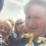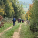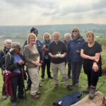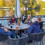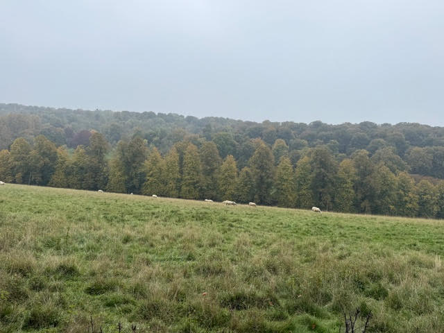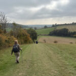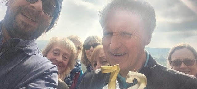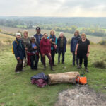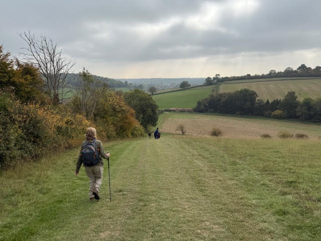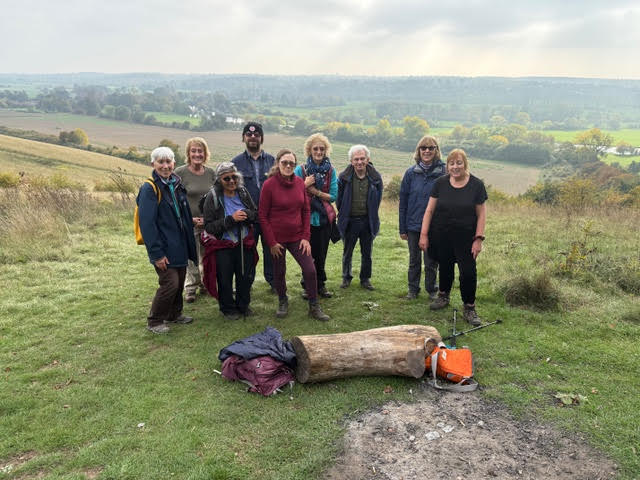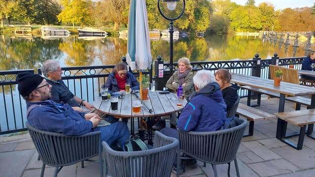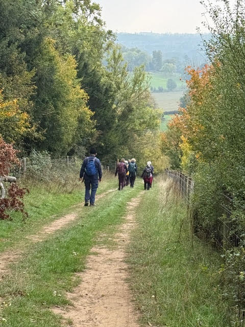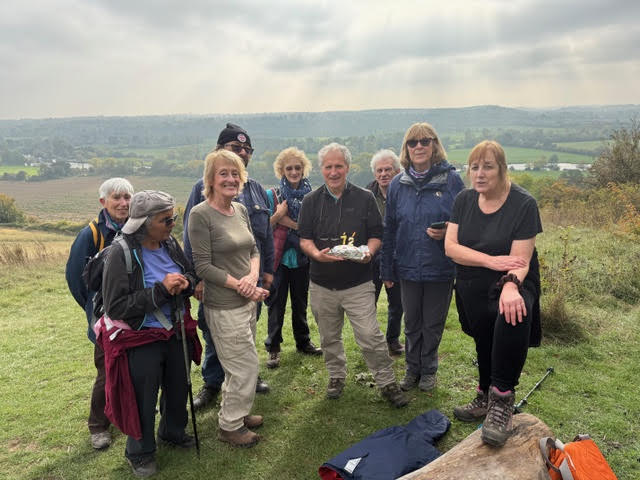 Ten of us set off from Goring on what was a cool and misty morning.  The walk was mostly through woods, with some long inclines and a few steep grassy inclines. Along the way we came across two baskets of apples with a ‘help yourself’ note. They looked good and were delicious. We split our lunch into two stops, the first in an open grassy space with a lovely view of the Thames valley. By this time the sun had come out and it was much warmer. Our second stop had an even more magnificent view which we enjoyed whilst indulging in birthday cake produced by Lindy, with candles, from her bag, and Mary was tasked with cutting. As well as Chris’ birthday we were also able to celebrate Ian’s recovering a CFC hat he dropped on the walkover, a couple of weeks previously.  Some kind person had placed it on a post.  After cake we had a couple of group photos before descending the quite steep grassy slope. On the route we came across quite a few pheasants and a few horses. At the end of the lovely walk, near Pangbourne station, many of us continued Chris’ birthday celebrations with a visit to a lovely local pub (low ceilings!) and sat overlooking the river. A good day out indeed!