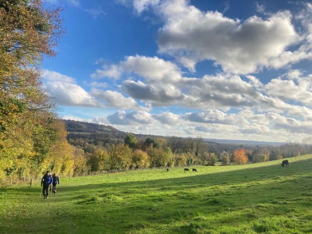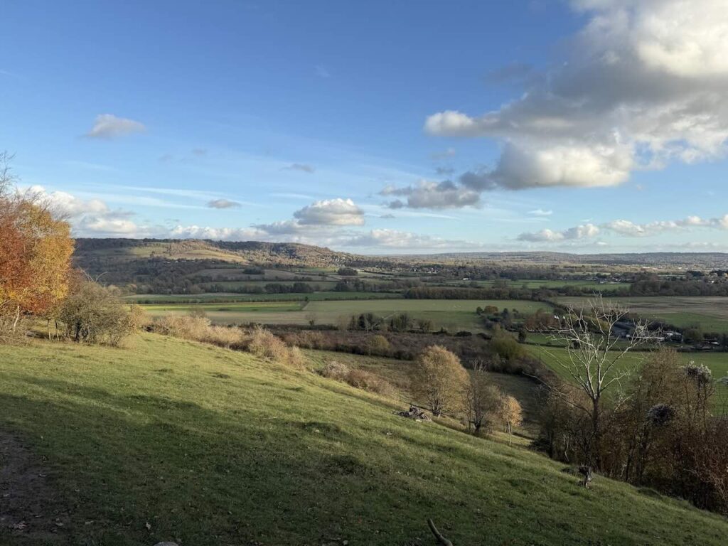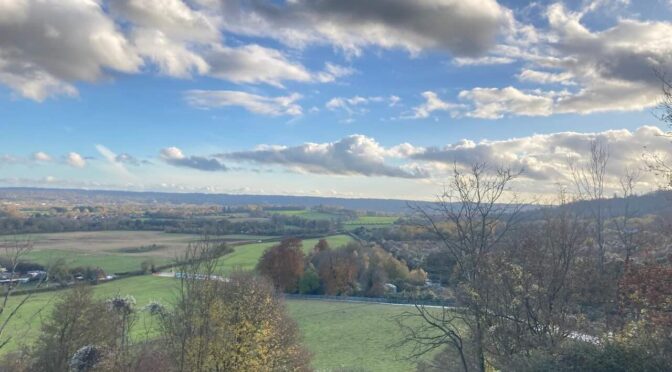At this point two of our group headed home via Shoreham station while the rest of us and Geoffrey did the long steady climb up to the summit of the hill on the other other side of the valley.  Including passing through a field of bullocks who ignored us (phew). Most of the hill is thickly wooded and it is a lovely experience walking through the woods on a fresh afternoon.  Nearing the top Geoffrey turned back to avoid aggravating his ankle injury.   The rest of us continued and eventually emerged from the woods.  We stopped for a water break and some very fine views across the Darent Valley and beyond.