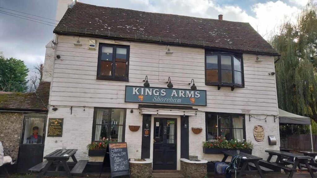 We took our time down these slippery steps arriving at a busy road just before Shoreham.   Then we went through the Churchyard and stopped for lunch outside the Kings Arms where I had made a reservation.   Some walkers went to the Honeypot Cafe and others had brought there own food.