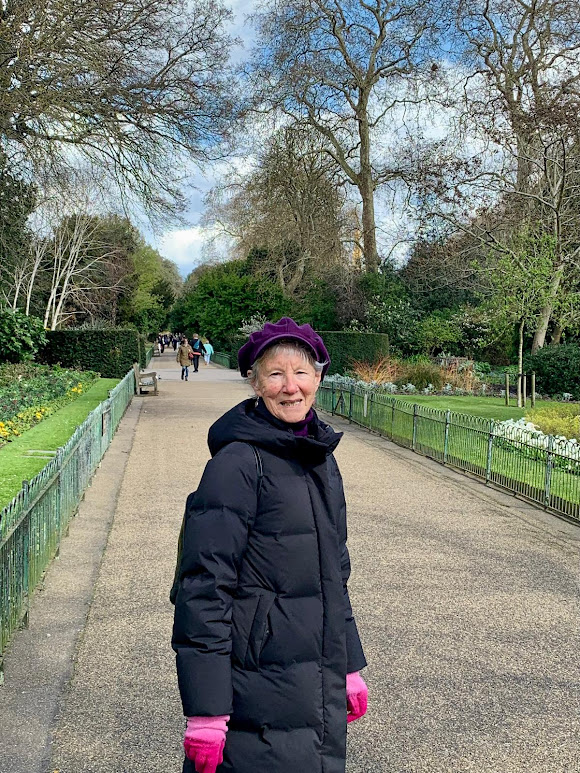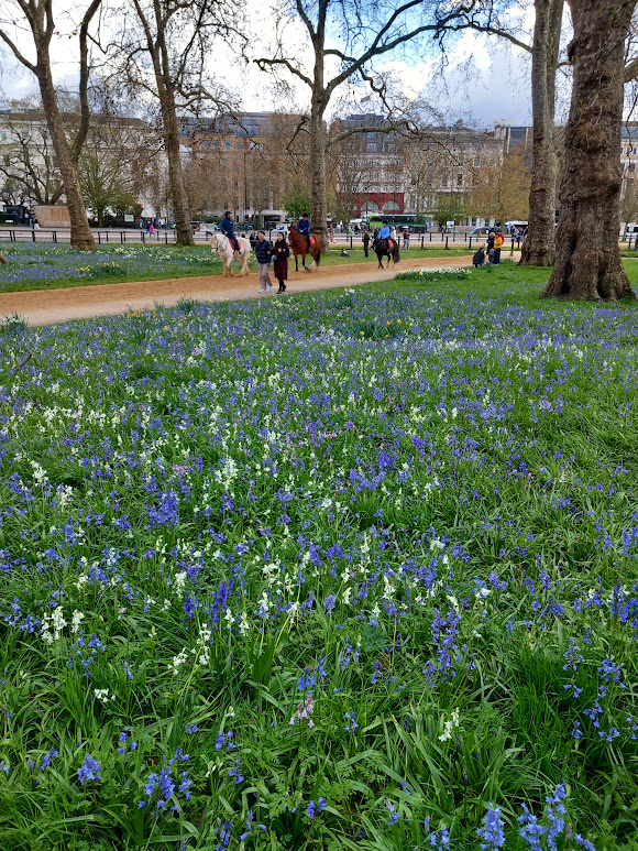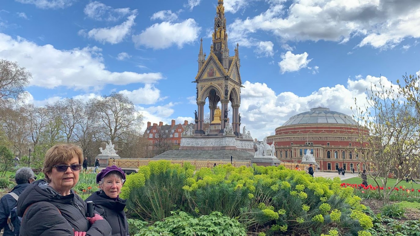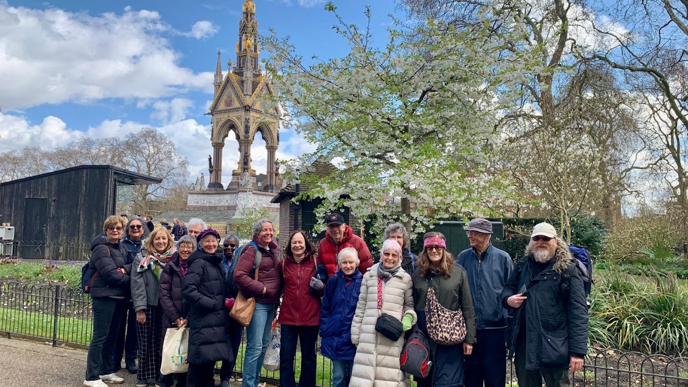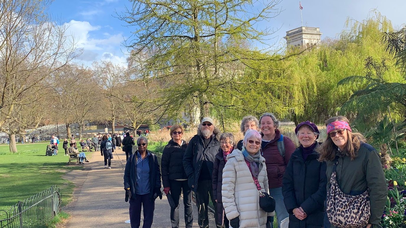 Following the meeting and a plentiful buffet lunch, 16 walkers set off to amble through the Royal Parks. The sky was a mixture of brilliant blue and a few grey clouds. Luckily we didn’t have a repeat of lasts year’s deluge. We passed through beautiful flower beds along the side of the Albert Memorial, crowds of tourists taking in the afternoon sunshine and heard the shouts of the demonstrators on what looked to be a peaceful march through the Hyde Park area.