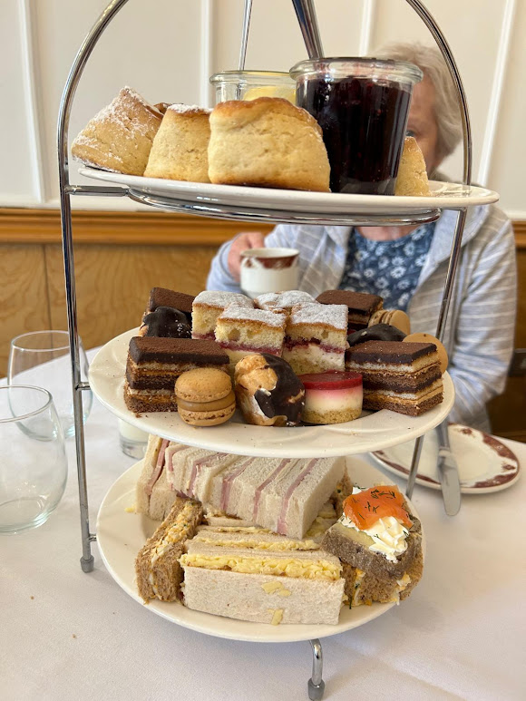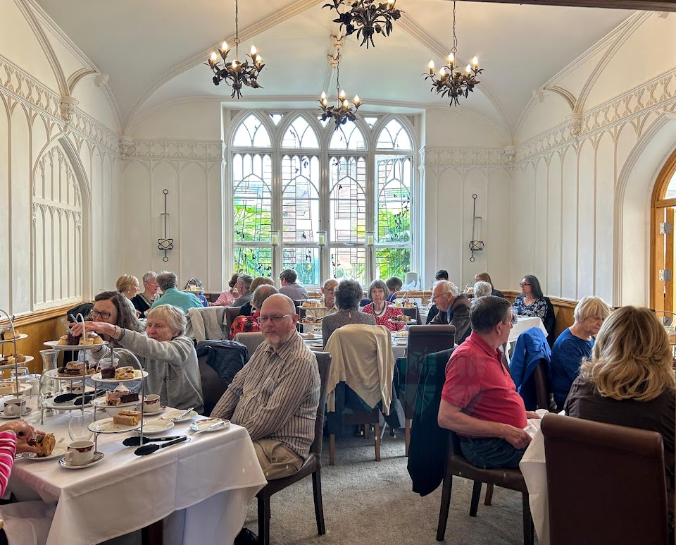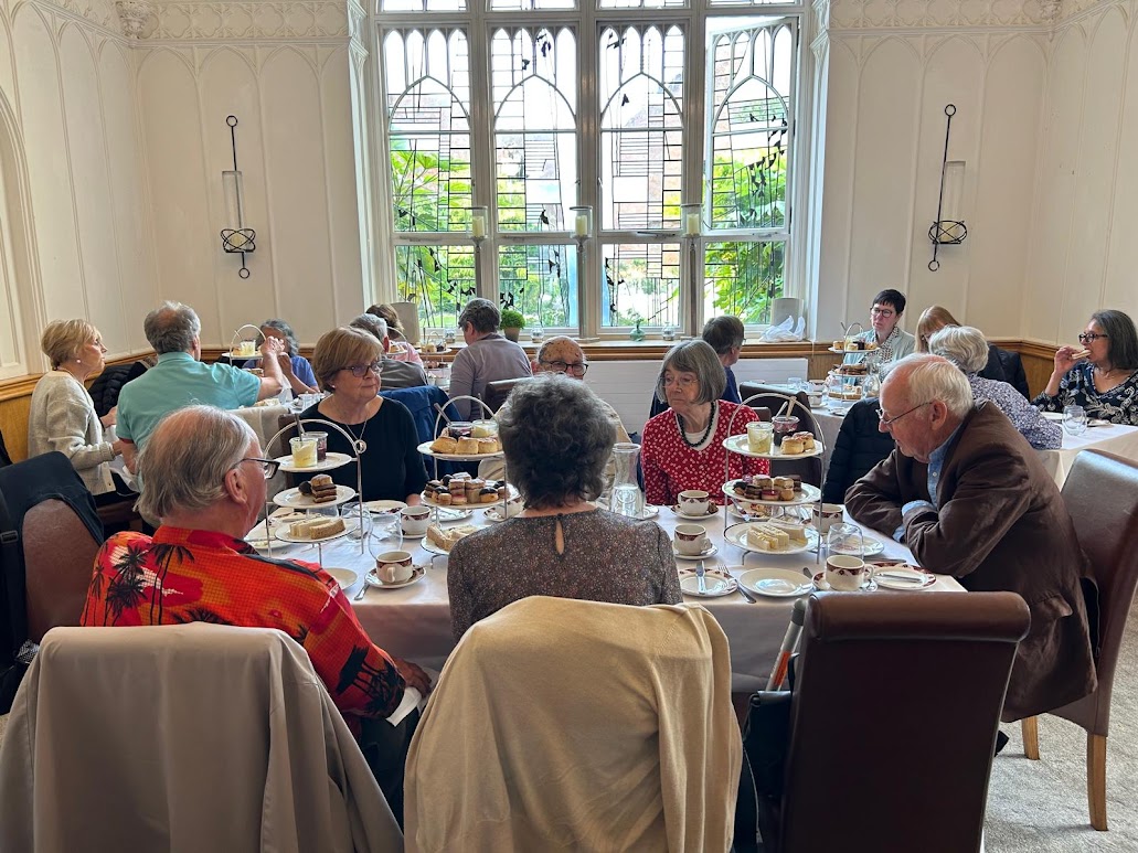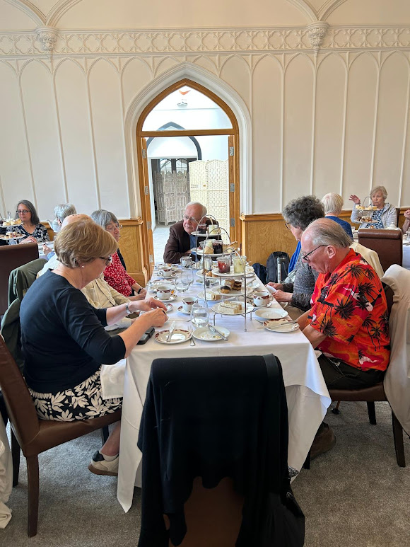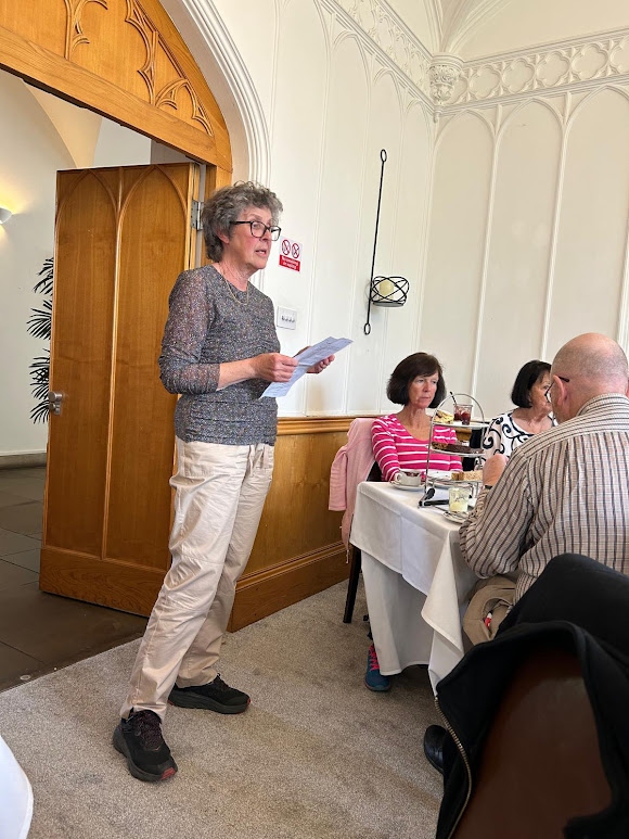 Missenden Abbey is a 12th century former medieval abbey, now used as a conference and events venue. It was the first time I had been there since Stuart and I got married there 24 years ago. Thirty four Poly Ramblers gathered for tea in the very pleasant Fleetwood room. I had requested a traditional afternoon tea served at the table so I was a bit disconcerted to find guests queuing for self service tea and coffee! Once that (and some confusion about the vegetarian sandwiches) was resolved, we sat down to a plentiful array of delicious sandwiches, cakes and scones with cream and jam.