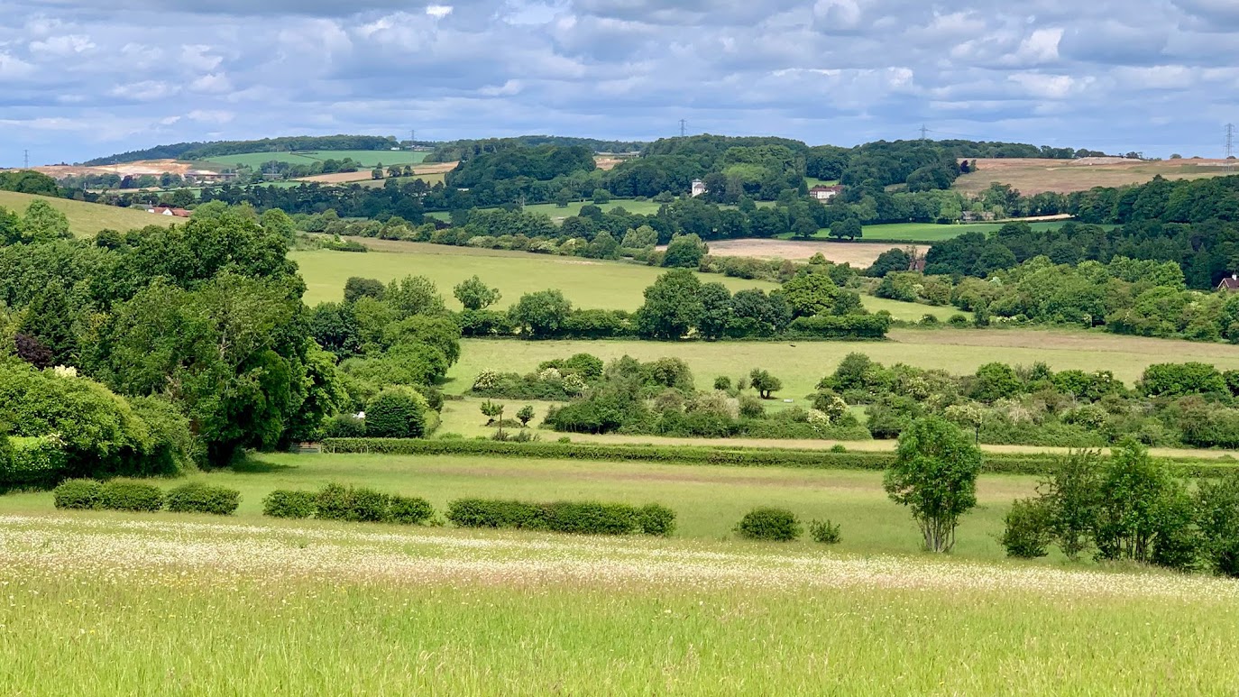 Yvonne Delahaye led us on a lovely circuit of the town with some gentle climbs rewarded by splendid views over the Chiltern Hills. After descending through woods a small group led by Danny took a shortcut back into the town (to go to the pub?!) while the rest of us climbed through woods and descended again to reach St Peter’s and St Paul’s church where we paused to view Roald Dahl’s grave before continuing to the Abbey.