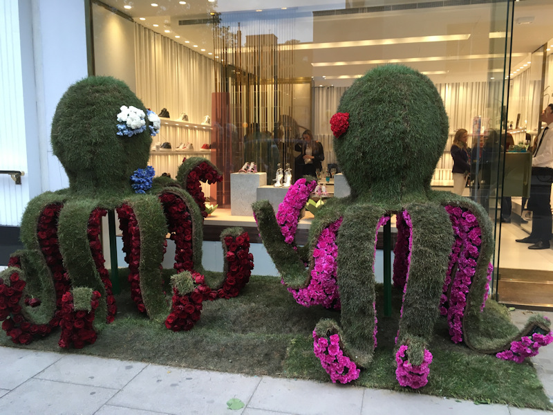 This is an annual festival of floral art in shops, restaurants and hotels in the neighbourhood of the RHS Chelsea Flower Show. The theme this year is ‘Under the Sea’. Approximately 20 Polyramblers and guests met at Sloane Square tube station to do a walk to see as many floral displays as possible. We went up and down Sloane Street, Pavilion Road where we met Lorna and her mum doing the same as us, up and down King’s Road and Duke of York Square. We were all very impressed by the beautiful displays.