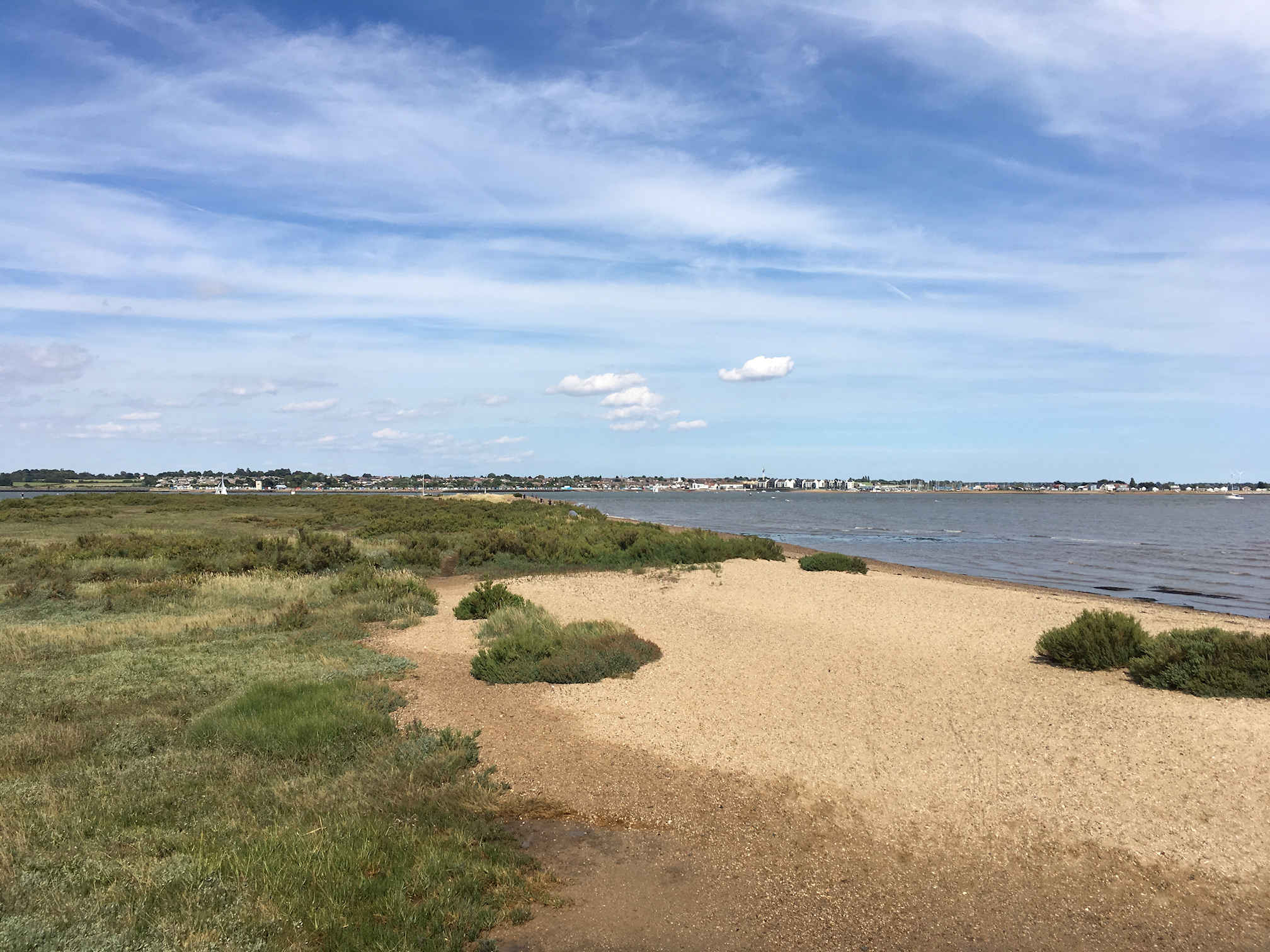 After a long but smooth journey, 8 Polyramblers arrived in West Mersea to be met by Gini who was spending the weekend with a friend who lives on Mersea. It was sunny but not too hot and the tide was coming in when we started our walk clockwise out of the small town. We passed lovely houses and were soon on the sea wall. The first part of the walk was quiet with tidal flats on one side and farmland on the other. We had our picnic lunch facing the Pyefleet Channel and continued along the sea wall. Each pace we took resulted in clouds of common blue and small heath butterflies. As we walked to the tip of the island with Brightlingsea on the other side of the Colne estuarty, the path became busier with holidaymakers strolling along the beach. We followed the Blackwater estuary and stopped for an ice cream at Cudmore Grove Country Park and continued along the beach, passing a few caravan parks. It became cloudy as we walked along bits of the sea wall that had collapsed. We reached the pretty beach huts of West Mersea and, as we walked through the town, we were grateful to see our bus coming towards us just as we were passing a bus stop. Very fortuitous after a lovely 13 mile walk.