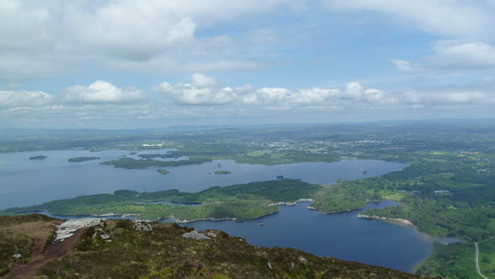 We had advance warning that there was no defined path and to be aware of a number of possible hazards along the way. We arrived in time for our minibus containing 13 Hikers to park in one of the few car park spaces left with a steep and well marked out path ahead of us to make a steady determined ascent, only to be  overtaken by a number of climbers half our age including a couple with a six years old child. We were rewarded with a cloudless sky and a beautiful vista of the other ranges and surrounding lakes. The ascent towards the peak did indeed prove to be hazardous and very steep with a number of loose stones and rocks interspersed with grass. We reached the point where a cairn marked the first summit of Caher and  all that remained was a steep ridge to the top of the mountain. Some of the group managed the scramble up to the cairn taking in the panoramic views below, before returning to the main group. A thoroughly enjoyable day and a great test of our fitness!